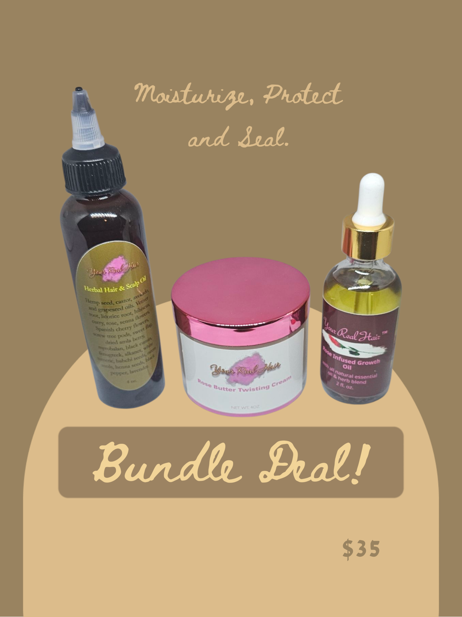 Meet your hair’s new MVPs—all in one nourishing trio. This bundle features our best-selling essentials designed to lock in moisture, protect your strands, and encourage healthy growth from root to tip. Whether you're styling, sealing, or simply showing your crown some love, these three work together like magic.